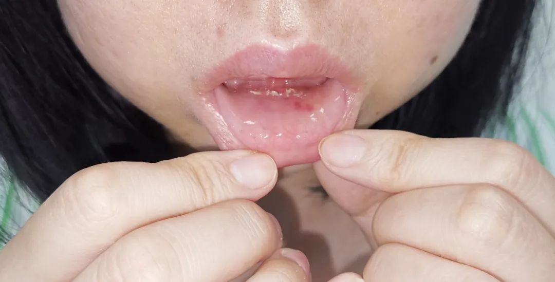 患者手术后第2天,下唇伤口情况(下唇见可吸收线结),患者已可自由进食,嘴唇无疼痛不适。