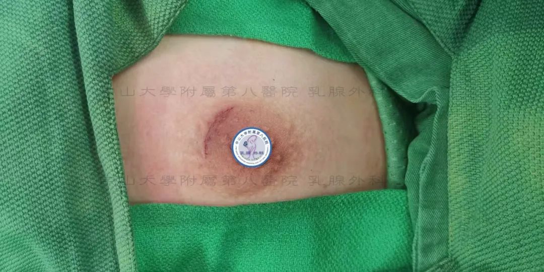 乳腺肿物常规外科治疗方式是开放手术切除,为了切口美观,大多会将切口置入乳晕边缘,利用乳晕和正常皮肤的色差来减少瘢痕对外观的影响。