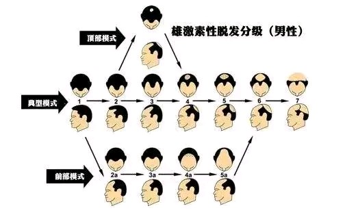 男性最初表现为前额额角及发际线头发变细稀疏,逐渐发展会形成高额,进而与顶部脱发区域融合,严重者仅枕部及两侧颞部保留少量头发,也就是大家俗称的“地中海”。