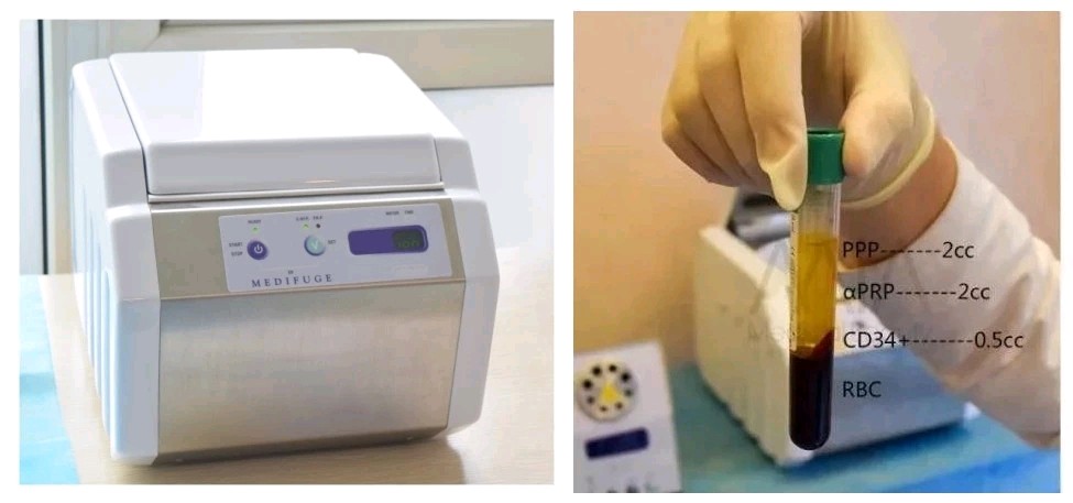 CGF全称为Concentrate Growth Factors,中文翻译为浓缩生长因子,是利用特制的变速离心机,依靠物理性加速度和减速度充分激活血小板中的α颗粒,产生富含更高浓度生长因子和CD34+细胞的自体血液浓缩制品,表现出更佳的骨组织、软组织及皮肤的再生能力。在2006年由Sacco提出并应用于临床。抽取自体静脉血,经意大利Silfradent(塞法登特)公司生产的Medifuge 200变速离心系统离心约13分钟,每9ml血液可分离出约2.5ml液态CGF(LPCGF)。根据离心试管制备工艺的不同,可制备出液态、松散凝胶态、凝胶态三种性状CGF。