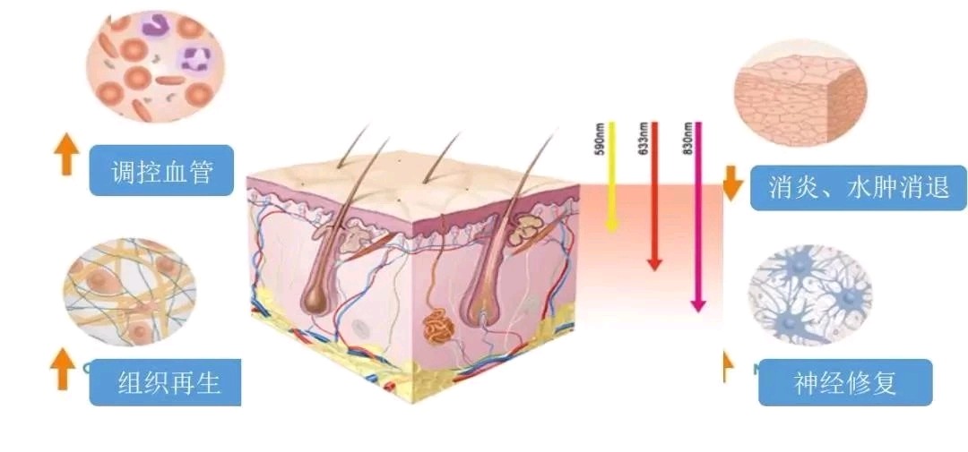 830nm光照可减轻疼痛、消除炎症、促进愈合,提高巨噬细胞活性、促进炎症因子代谢,促进纤维细胞增殖,增强皮肤厚度。