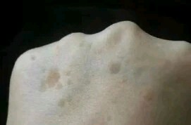 皮损多发于面部、手背、手臂,表现为正常肤色或浅褐色大小不等的扁平丘疹,轻度隆起,表面光滑,呈圆形、椭圆形或多角形,境界清楚,可密集分布或由于局部搔抓而呈线状排列,一般无自觉症状。
