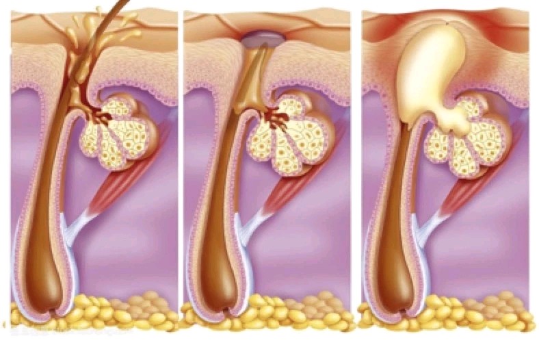 为什么会长痘?痤疮的本质其实是毛囊皮脂腺出问题了。