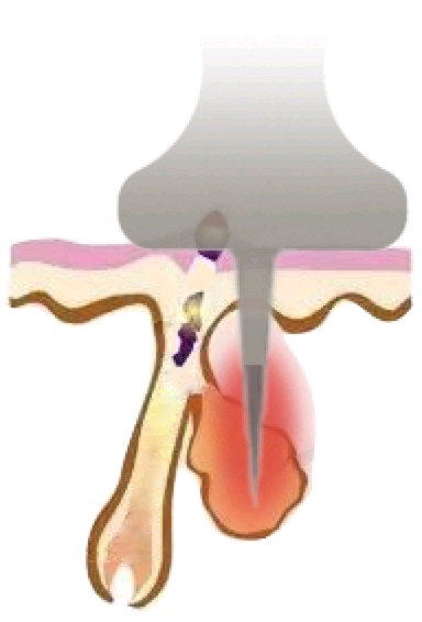 它是中药火针和射频技术的完美结合,它利用针体部分绝缘的细小黄金微针将RF能量精确作用于皮脂腺,让皮脂腺萎縮、变性,从而达到治疗痤疮的目地 。