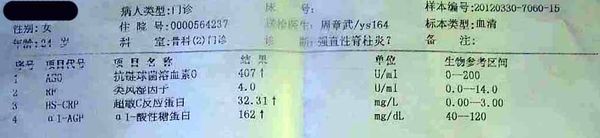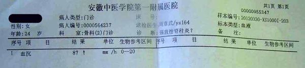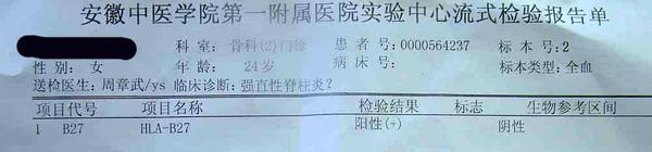 周章武医生,经检查确诊为强直性脊柱炎(图片及化验结果附后)。