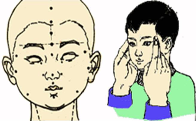 手法:以两拇指揉或运太阳穴,向前为补,向后为泻,外感表实证用泻法;外感表虚、内伤头痛为补法。