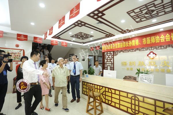出席本次大会的孙隆椿还专程前往深圳肤康皮肤病专科进行视察和工作,孙部长饶有兴致的参观了医生诊室、治疗区、中西药房、检验中心等临床一线,他指出,我们办学术大会的目的是为了更好的服务临床,所以这次大会成果一定要用好。他勉励深圳肤康一线临床医疗医技人员,要做好学科建设,抓医疗质量管理,用新成果结合医院中医特色,办一所人民满意的好医院。