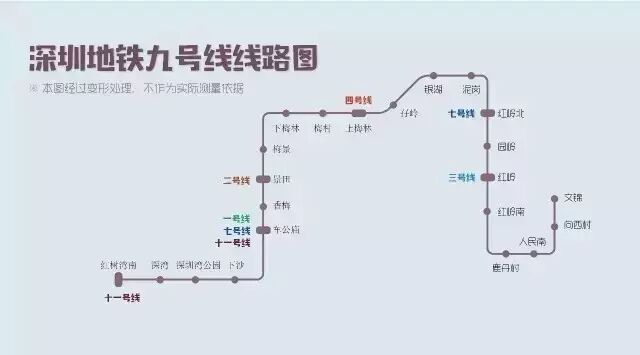 深圳地铁9号线全长约25公里,纵贯南山、福田、罗湖三区,起于南山区白石四路,通过香梅路,经景田路,沿梅林路,至罗湖区文锦南路,预计设置车站22座。主要站点包括:红树湾-深湾-深圳湾公园-下沙-车公庙-香梅-景田-梅景-下梅林-梅村-上梅林-孖岭-银湖-泥岗-红岭北-园岭-红岭-红岭南-鹿丹村-人民南-向西村-文锦。