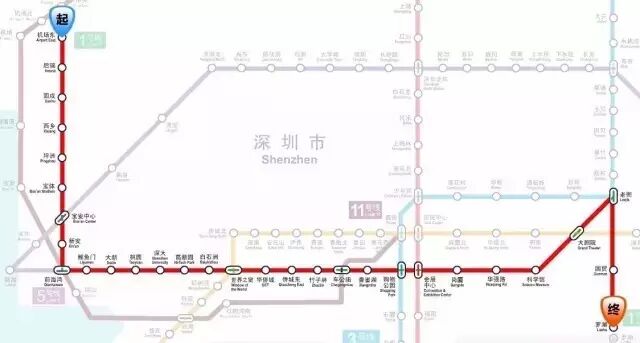 深圳地铁1号线途径宝安、南山、福田、罗湖4个区,设有站点30个:罗湖-国贸-老街-大剧院-科学馆-华强路-岗厦-会展中心-购物公园-香蜜湖-车公庙-竹子林-侨城东-华侨城-世界之窗-白石洲-高新园-深大-桃园-大新-鲤鱼门-前海湾-新安-宝安中心-宝体-坪洲-西乡-固戍-后瑞-机场东。